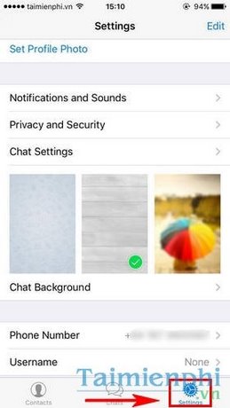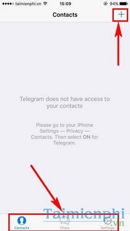 Bước 5: Có 3 tùy chỉnh chính phía dưới Telegram là Contacts (Liên hệ), Chats (Gửi tin nhắn) và Settings (Cài đặt). Muốn thêm bạn vào Telegram, chọn dấu + ở góc phải phía trên.